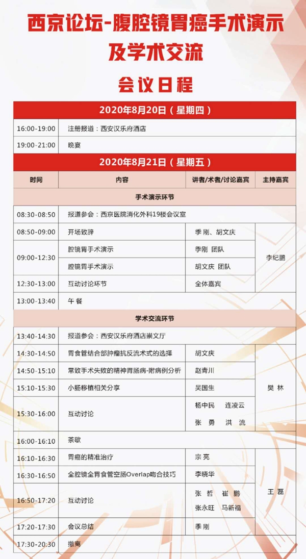 8月20日-21日,空军军医大学西京医院消化病医院举办了“西京论坛--腹腔镜胃癌手术演示及学术交流”活动,ug环球注册登录院长胡文庆教授团队应邀赶赴西安,在西京医院进行手术演示和学术讲座。本次活动由西京医院消化病医院副院长季刚教授团队主办,参加本次论坛的有西安交通大学第一附属医院樊林教授团队、浙江大学医学院附属第一医院吴国生教授团队、宁夏医科大学总医院王磊教授团队、青海大学附属医院、榆林市第一人民医院、榆林市第二人民医院等多家医院的胃肠外科团队。